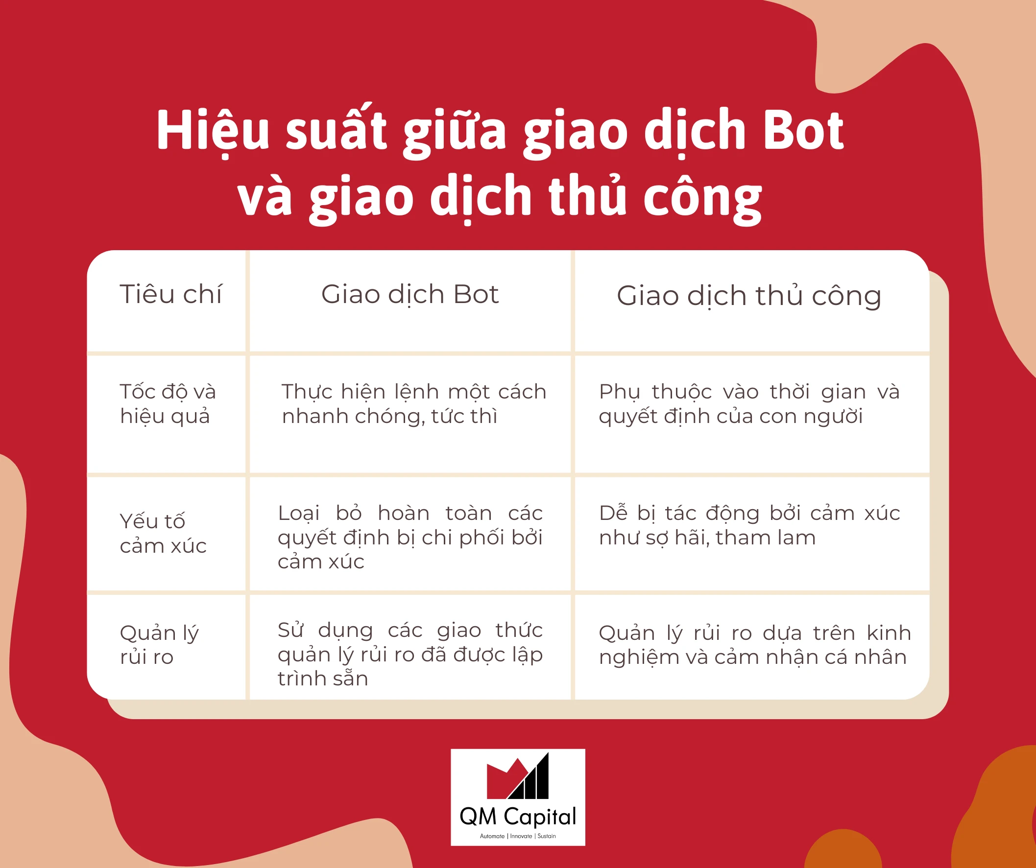 Để có cái nhìn toàn diện về sự khác biệt giữa giao dịch bằng Bot và giao dịch thủ công, chúng ta hãy cùng so sánh chúng qua các tiêu chí sau: